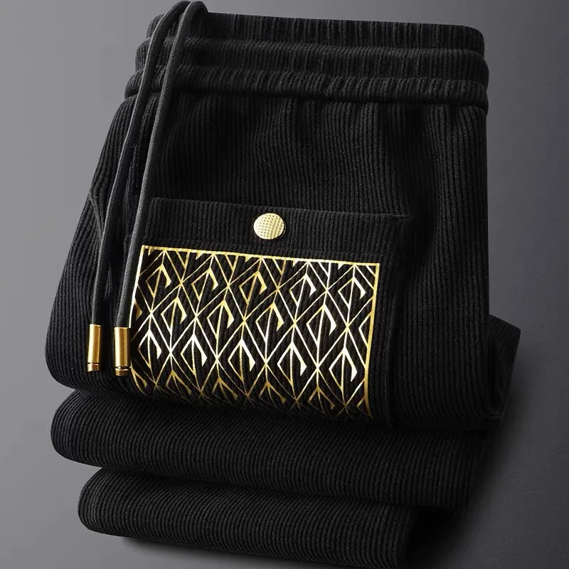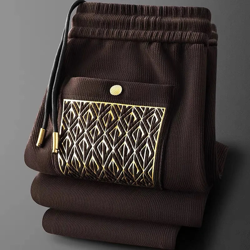 Not your average trousers—these are a statement in motion. Crafted from a signature cotton blend with a ribbed texture and gold-thread detailing, they offer all-day comfort with standout style. Whether you're jet-setting, unwinding, or stepping out, these trousers move with you and turn heads while doing it.